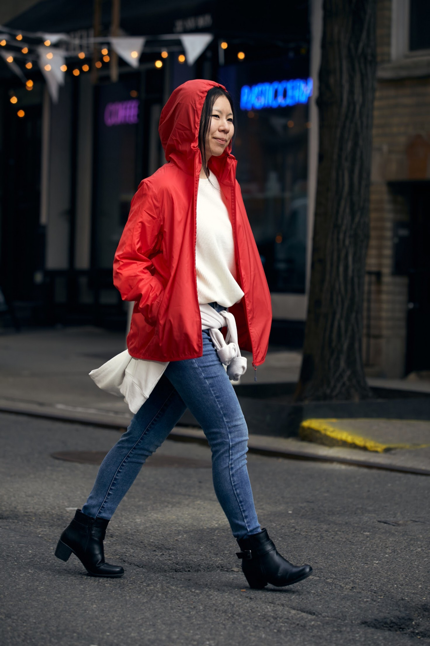 Red raincoat shop outfit