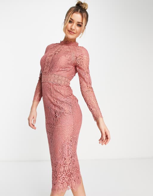 Asos design lace long shop sleeve midi pencil dress
